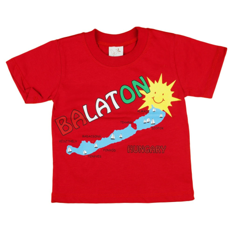Vidám, piros rövid ujjú póló "Balaton" felirattal, amely tökéletes választás a nyári szezonra. A termék 100% pamutból készült, így biztosítja a kényelmet és tartósságot még a forró napokon is. Az 80-128-as mérettartomány széles választékot kínál, így szin
