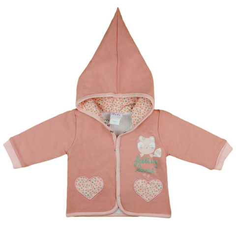 Kényelmetes és praktikus kapucnis kocsikabát, amely púderszínű háttéren aranyos cicás mintával díszített. Az elöl patentos zárás könnyűvé teszi a felöltöztetést és a levetkőztetést. Az anyagösszetétel 90% pamut és 10% elasztán, amely puha tapintást és rug