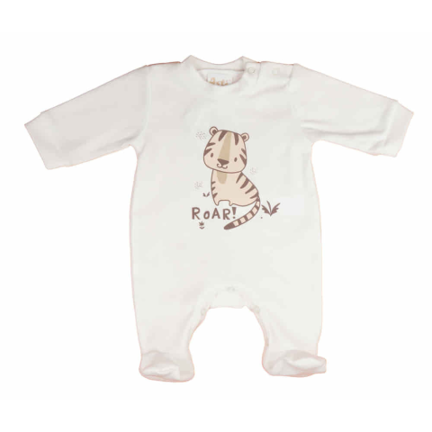 Ez a biopamut hosszú ujjú rugdalózó a legkisebbeknek tervezett praktikus viseleti darab. A nyers alapszín fölött vidám tigris minta fut végig, amely játékos és egyedi megjelenést ad. A vállán és a lábn elhelyezkedő patentok jelentősen megkönnyítik a pelen