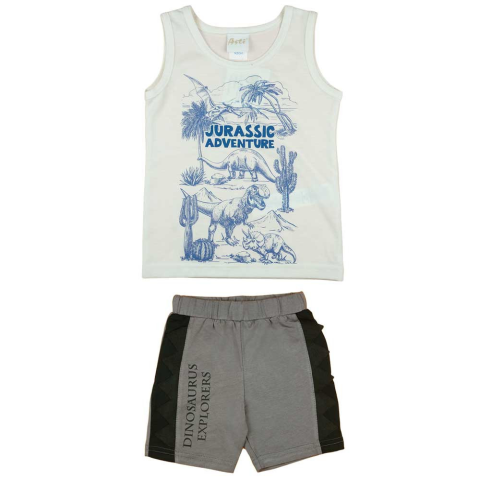 Merüljön el a dinoszauruszok világában ezzel a praktikus két darabos szettel! A fehér atléta vékony pamutból készült, amely dinoszauruszos mintával díszített – ideális választás a meleg nyári napokra. A szett rövidnadrágja dinoszauruszos felirattal és old