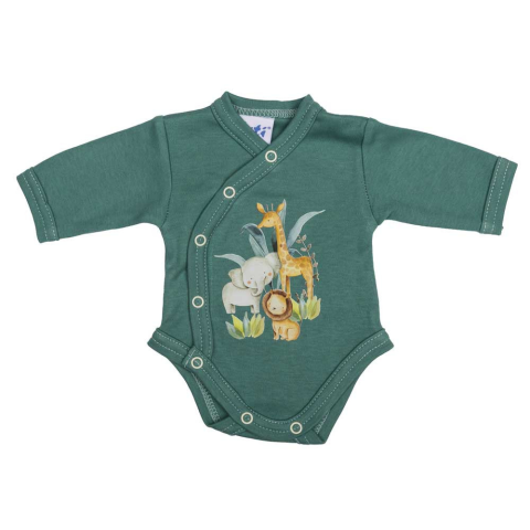 Bájos és kényelmes viseletet biztosít a kisbabádnak ez a szafaris mintájú hosszú ujjú body. A zöld szín ideális alap bármilyen ruhadarabhoz, így könnyű összeállítani vele a különböző outfiteket. A termék 100% pamutból készült, amely puha és tartós, I. osz