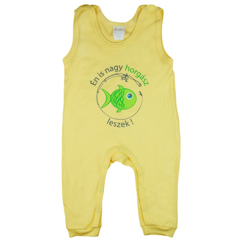 Sárga, ujjatlan rugdalózó, amely tökéletes választás a kis horgász aspiránsoknak. A "Én is nagy horgász leszek!" felirat és játékos halacska minta teszi egyedivé, míg a vállon elhelyezett patentok megkönnyítik a fel- és levetkőztetést. A vékony pamutból k