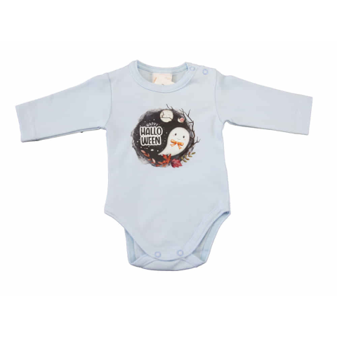 Szép Halloween-es mintával díszített hosszú ujjú baba body, amely bababarát 100% pamut anyagból készült. Az anyag szín- és formatartó, így kiváló minőségben bírja a gyakori mosásokat is. A vállán található patentos konstrukció egyszerűvé teszi az öltöztet