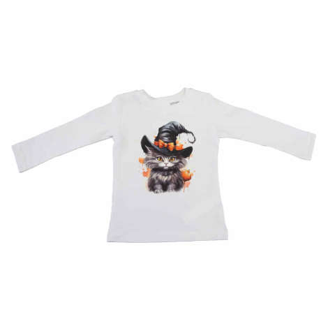 Hosszú ujjú kislány póló Halloween-es mintával, mely puha pamutból készült. A darab 90% pamutot és 10% elasztánt tartalmaz, így kényelmes és rugalmas viselet. A szövet jól tűri az ismételt mosást, miközben megtartja eredeti színét és alakját. Minőségi mag