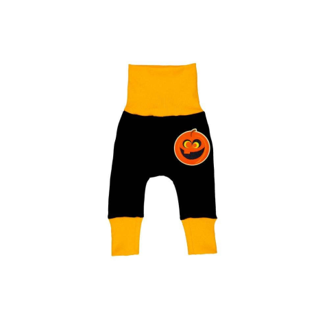 Örömteli Halloween-témájú baba nadrág tökös nyomattal, amely tökéletesen alkalmas az ünnephez és a hétköznapi viselethez. A fenék részén található rávarrt folt praktikus védelemmel szolgál, míg a derék és a lábak felhajtható, illetve lehajtható kialakítás
