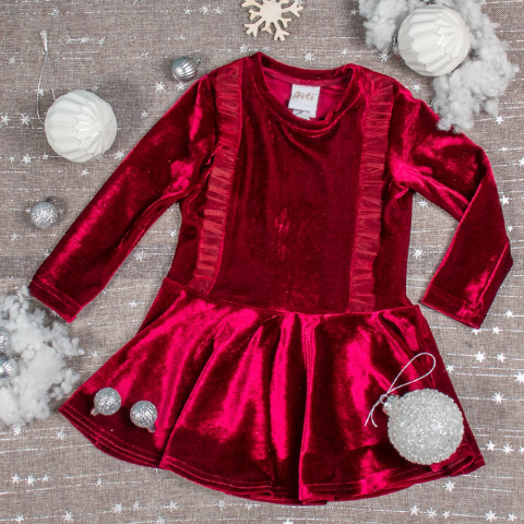 Elegáns, hosszú ujjú kislány ruha bársonyból, amely tökéletes választás alkalmi és ünnepélyes alkalmakra. A puha bársony anyag kellemes tapintást biztosít, míg a hosszú ujjak klassz megjelenést adnak. Az összeöltözet könnyen kombinálható különféle cipőkke
