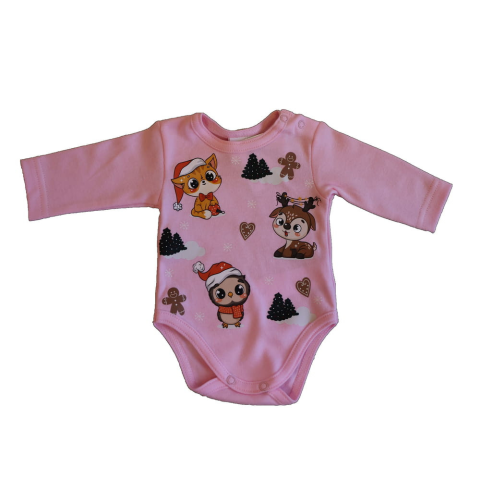 Kisbabák ruhatárának praktikus alapdarabja ez a hosszú ujjú body, amely szép karácsonyi mintával és kedves télapósapis állatokkal díszített. Tökéletes választás a hideg téli szezonra, hiszen a hosszú ujjak jó védelmet nyújtanak.