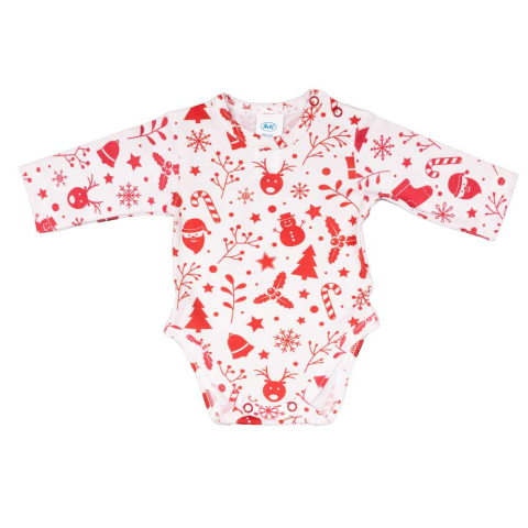 Kisbabád ruhatárának tökéletes alapdarabja ez a hosszú ujjú body, amely kedves karácsonyi mintájával még ünnepiesebbé teszi az apróság megjelenését. Puha, bababarát elasztikus pamutból készült, amely 90% pamotot és 10% elasztánt tartalmaz, így ideális vál