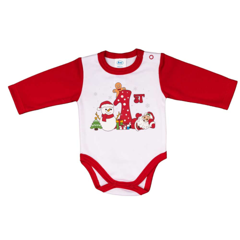 Kisbabák ruhatárának praktikus alapdarabja ez a hosszú ujjú body, amely vidám karácsonyi mintával díszített. Tökéletes választás a hideg téli hónapokra, hiszen megbízható védelmet nyújt a hideg ellen. A test megegyezés a minőségi, 100%-ban pamutból készül