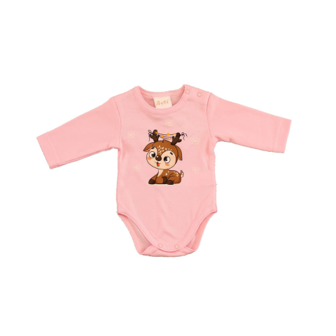 Kisbabák ruhatárának praktikus alapdarabja ez a hosszú ujjú body, amely vidám karácsonyi, rénszarvas mintával díszített. A hideg téli hónapokra tökéletesen alkalmas, kényelmes viselet babáddal.