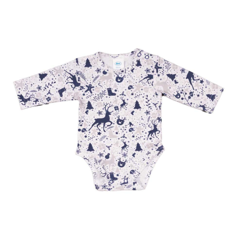 Kisbabád ruhatárának tökéletes alapdarabja ez a hosszú ujjú body, amelyet egy vidám karácsonyi minta díszít. A hideg téli hónapokra ideális választás, hiszen a hosszú ujjak extra melegen tartják a babát.