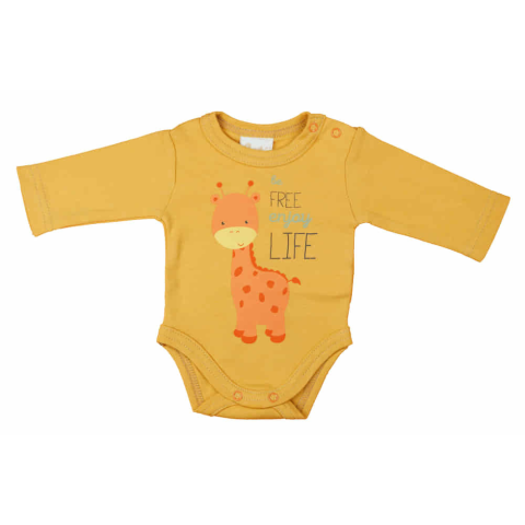 Puha, kényelmes hosszú ujjú body, amely okker színben és 100% pamutból készült, így ideális választás a babád napi viseletéhez. Az ötletes zsiráf minta vidám hangulatot ad a ruhadarabnak, amely bababarát anyagából adódóan biztosítja a tökéletes kényelmet