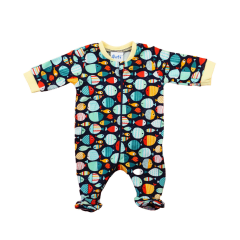 Ez a hosszú ujjú rugdalózó a halacskás mintájával teljesen elvarázsol majd! A sötétkék alapon található vidám halacskák garantáltan kedvencévé válnak a kisbabáé. Az elöl cipzáros megoldás nagyon praktikus – a pelenkázás és öltöztetés még egyszerűbbé válik