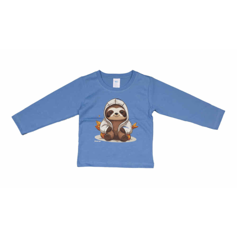 Egy igazán csibészes megjelenést kölcsönözhet kisfiadnak ez a hosszú ujjú fiú póló, amelyen vagány lajhár minta díszeleg. A középkék színű alapdarab kiválóan alkalmas óvodai napokra vagy játszótéri kalandokra. Kényelmes és praktikus viselet, ami egy farme