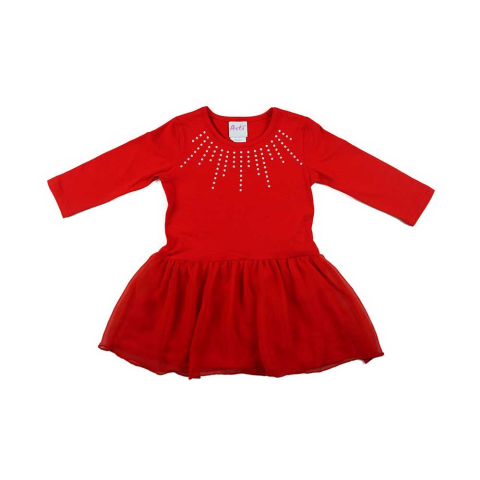 Ez a gyönyörű piros hosszú ujjú ruha tökéletes választás a kislányok számára. A finom muszlin szoknya és az ezüst nyomat a nyaknál elegáns, mégis vidám hatást kell hozzáadni. Az alapanyag 90% pamut és 10% elasztán keverékéből készült, így garantáltan kény