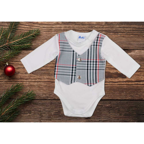 Kényelmes és praktikus megoldás a kisfiúk mindennapi gardróbjához. Ez a hosszú ujjú body szürke színével és rávarrt mellényes részletével elegáns megjelenést biztosít. A vállon elhelyezett patentok egyszerűvé teszik a fel- és levétést, így a napi rutinok