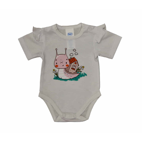 Ez a puha, 100% pamut anyagból készült baba body rövid fodros ujjakkal és vidám csigás mintával ideális a kényelmet és stílust egyaránt értékelő szülőknek. A fehér alapszín jól kombinálható más ruhadarabokkal, így könnyű összeállítani különféle megjelenés