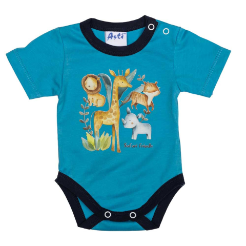 A türkiz színű, rövid ujjú baba body egy vidám szafaris mintával díszített, amely biztosan lenyűgözi a babát és a szülőket egyaránt. Az 100% pamutból készült ruhadarab puha és kényelmes, tökéletesen alkalmas az érzékeny bőr számára, miközben gondoskodik a