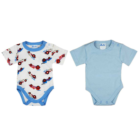 Bájosan mintás, rövid ujjú baba body szett, amely a legkisebb fiúk számára ideális megoldás. A csomag két darab vállon patentos bodyt tartalmaz, vékony pamutból készült anyagból, amely kényelmes viseletérzetet biztosít. Az egész termék 100%-os pamutból ké