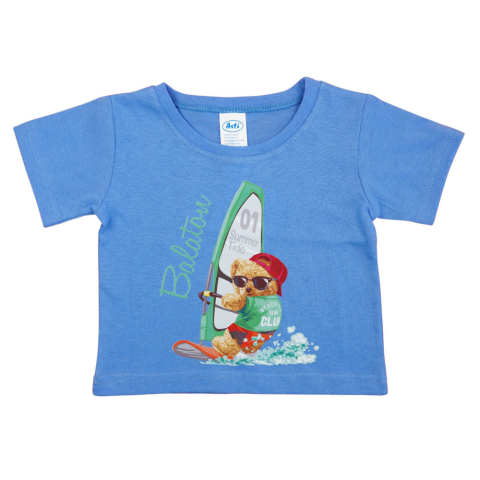 Ez a rövid ujjú póló ideális választás a nyári strandidényhez. A teljes mértékben pamutból készült anyag puha és kellemes a gyerek bőrén, garantálva a mozgásszabadságot és a maximális kényelmet. A friss kék szín tökéletes nyári viseletnek, míg a játékos s