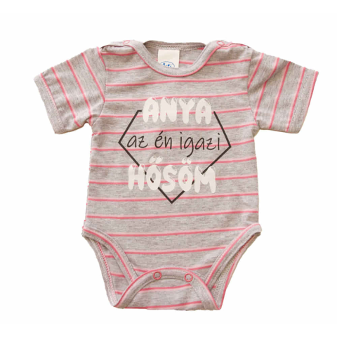 Puha, szürke csíkos rövid ujjú baba body, amely az "Anya az én igazi hősöm" felirattal készült. A termék 100% pamutból gyártott, biztosítva ezzel a maximális kényelmet és lélegzőképességet az apró viselethez. A vállnál és az alul elhelyezett dupla patento