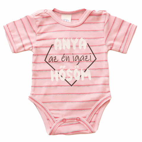Öltöztesd a kisbabádat ebbe a rózsaszín csíkos, rövid ujjú bodyba, amelyen az "Anya az én igazi hősöm" felirat gyönyörűen sorakozik. A body vállánál mindkét oldalon és az alján dupla patenttal szerelt, így könnyen méretezhető a baba növekedésének megfelel