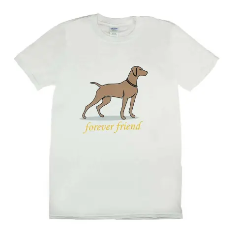 Vidám vizsla mintás rövid ujjú póló fiúknak, amely fehér alapon mutatja a kedves kutyaábrázolást. A 100% pamutból készült ruhadarab kényelmes, tartós és könnyen kezelhető, így ideális a gyermekek mindennapi viseletéhez. A magas minőségű anyag és gondos fe