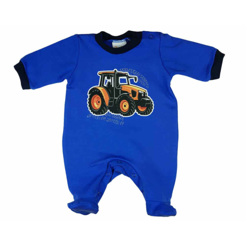Egy szépséges traktoros mintás rugdalózó, mely sötétkék alapszínével és belső bolyhos szövetével ideális választás az enyhébb napokra. A vállon elhelyezett patentoknak köszönhetően könnyűvé válik a fel- és levétel a kicsik számára. A termék 65% pamut és 3