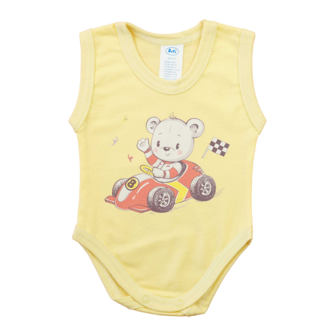 Ez az ujjatlan baba body a gépek és járművek szerelmeseinek tökéletes választása, barátságos maci figurával díszített. Az aranyos motívum gyerekbarát és vidám kinézetet ad, amely jól passzol a babák játékos szellemiségéhez. Az ruhadarab 100% pamutból kész
