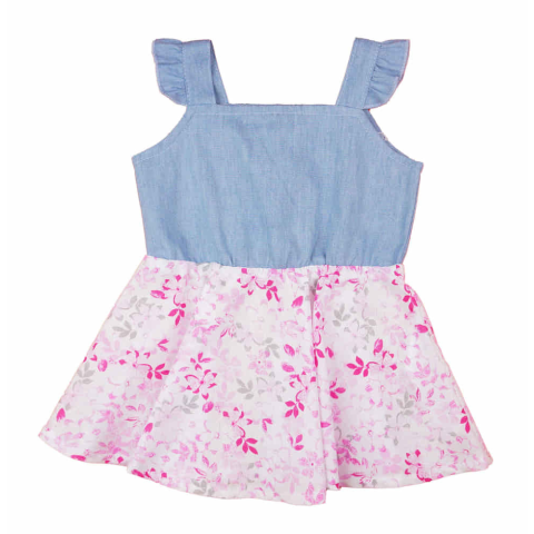 A kislányok szeretni fogják ezt az ujjatlan ruhát, melyen a fodros vállrész különlegesen csinos hatást kelt. A virágos kék-pink mintázat vidám, nyári viseletté teszi, ami könnyedén párosítható a hétköznapi programokhoz. A ruha 100% merev pamutból készült,