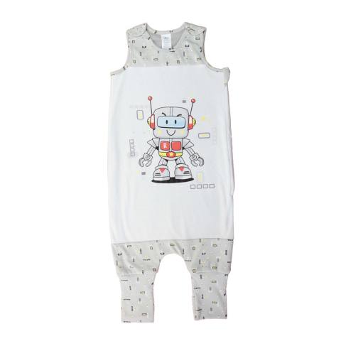 Ujjatlan tipegő hálózsák cuki robotos mintával, amely tökéletes választás a tipegő gyermekek számára. A 2 TOG-os, kétréteges konstrukció biztosítja a megfelelő melegítést az enyhébb évszakokban. Az ujjatlan kivitel és a vállon elhelyezett patentok garantá