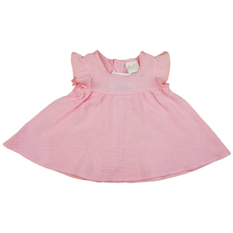 Puha, 100% pamutból készült ujjatlan ruha, amely tökéletes választás meleg időjáráshoz. A kellemes rózsaszín árnyalat és egyszerű, szellős szabása biztosítja a kislány kényelmes mozgását és a bőr megfelelő lélegzését. A hátul elhelyezkedő cipzár megkönnyí