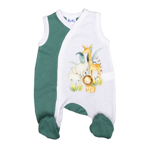 Vagány zöld szafaris mintás ujjatlan rugdalózó, amely tökéletes választás a meleg hónapokra. A vékony pamutból készült darab kiváló szellőzéssel rendelkezik és biztosítja a baba bőrének szükséges komfortot. A termék 100% minőségi pamutból gyártott, I. osz