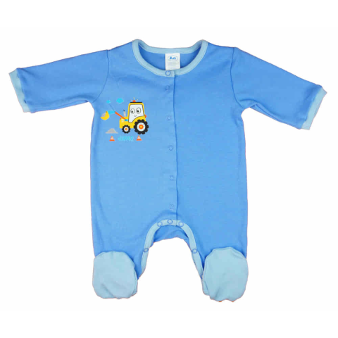 Különleges munkagépes mintával készült ez a kisfiú rugdalózó, amely még a legkisebb munkások számára is stílusos megjelenést biztosít. Az elöl patentos kialakítás nagy praktikumot hoz a mindennapi peluscserénél és öltöztetésnél, különösen újszülött babákn