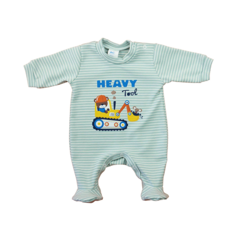 Praktikus és kényelmes megoldás az újszülöttek számára, amely csíkos alapanyagból készült, és vidám munkagép mintával van nyomva. A vállán és a lába között található patentok nagyban megkönnyítik az öltöztetést és a peluscsere során is jól használható. Ez