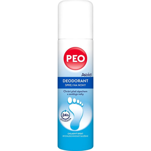 Lábspray - antibakteriális, hűsítő, lazító és izomlazító, ajánlott fájó lábakra és repedezett bőrre, szagok ellen, űrtartalma 150 ml Az ASTRID PEO lábdezodor spray megvédi a lábaidat a kellemetlen szagtól, miközben felfrissíti azokat. A hatékony összetétel megelőzi a kellemetlen szag kialakulását a baktériumok szaporodásának gátlás