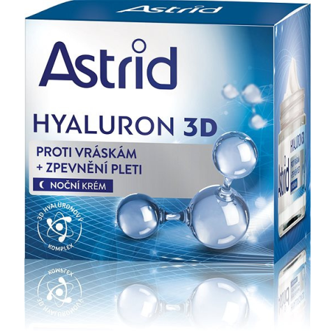 Arckrém - érett bőrre ajánlott,, hidratáló, ránctalanító és feszesítő / lifting, 35+ korosztály számára A jól bevált Astrid márka elhozza a továbbfejlesztett HYALURON 3D éjszakai krémet, amely jelentős feszesítő hatással bír. Már az első alkalmazás után feszesíti és feltölti a bőrt, és jelentősen segít