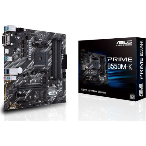 AM4, AMD B550, 4xDDR4, Max:3200MHz, Max:128GB, 1xPCIE16, 2xPCIE1, 4xSATA3, RAID, 6xUSB3.2, DVI, VGA, HDMI, PS2:1 db, 7.1, Gigabit, 2xM.2, Micro-ATX