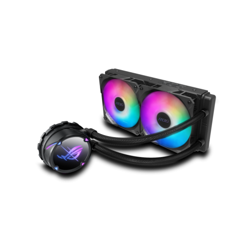 Kompakt, univerzális vízhűtés 2 darab 120mm-es vezérelhető ARGB világítású ventilátorral és vízhűtés blokkal. További extra, hogy a CPU hűtőblokkot egy világító ASUS ROG logó dísziti.