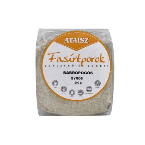 Ataisz bab ropogós gyros 200 g Magas fehérjetartalmú fasírtpor, mely gyorsan és könnyen elkészíthető. Fogyasztható főételként salátával, főzelékekhez vagy gabonákhoz feltétként, de tehetjük szendvicsbe is.