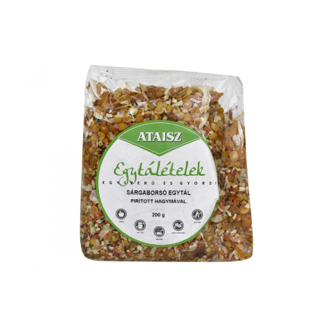 Ataisz sárgaborsó egytál pirított hagymával és vegyes zöldsé 200 g Allergén információ: A termék zellert, szezámmagot, búzát, zabot és olajosmagvakat is felhasználó üzemben készült. Átlagos tápanyagtartalom 100 g termékben: Energiatartalom:1546,22 Kj