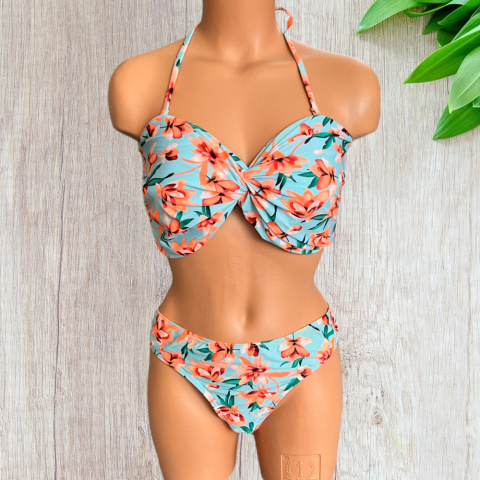 Narancs virágos bikini Felső része dekoltázsnál csavart és szivacsos. Vállpántja és hátpántja kötős. Hibátlan állapotú.