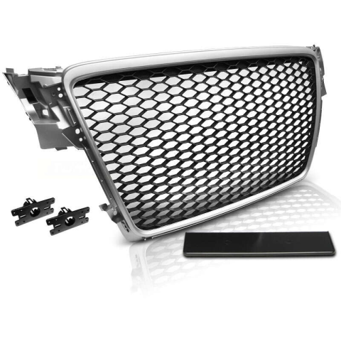 Audi A4 B8 (2008-2011) Ezüst Hűtőrács - Frissítse autóját! 😎 Adjon autójának egyedi megjelenést ezzel a kiváló minőségű, ezüst színű hűtőráccsal, amely kifejezetten az Audi A4 B8 (2008-2011) modellekhez készült. A fekete, méhsejt mintázatú rács mode...