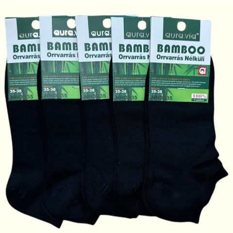 AURA.VIA Női Bamboo Bokazokni Fekete 5 par Ez az 5 pár fekete női bambusz bokazokni ideális választás mindennapi viselethez, sporthoz vagy otthoni használatra. A természetes bambusz anyag kiváló légáteresztő képességgel rendelkezik, puha és bőrbará