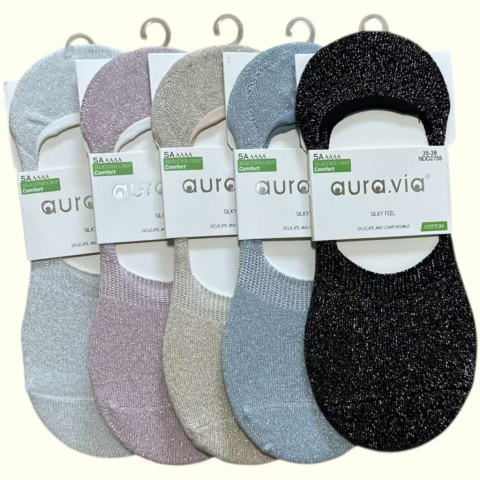 Aura.Via női csillogó titokzokni – szilikonpánttal, 5 pár Ez az 5 párból álló női csillogó titokzokni szett tökéletes választás balerinacipőhöz, mokaszinhez vagy más nyári lábbelikhez. A diszkrét, alacsony kivágású szabás biztosítja, hogy a zokni rejtve
