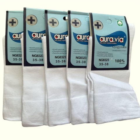 Fehér női egészségügyi pamut zokni (5 pár) Ez az 5 párból álló női egészségügyi zokni szett tiszta fehér színű. A saroktól a zokni tetejéig mért hossz kb. 19 cm (kézi mérés, a tényleges méret ettől kis mértékben eltérhet). Kímélő gumírozás, rugalmasa