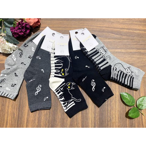Aura Via normál szárú zokni – kis macska zongorázik és zeneminta, pamut anyagból Az Aura Via normál szárú zokni kis macska zongorázó és zenemintás dizájnnal készült. Pamut anyagának köszönhetően kényelmes és légáteresztő, tökéletes mindennapi viselethez.