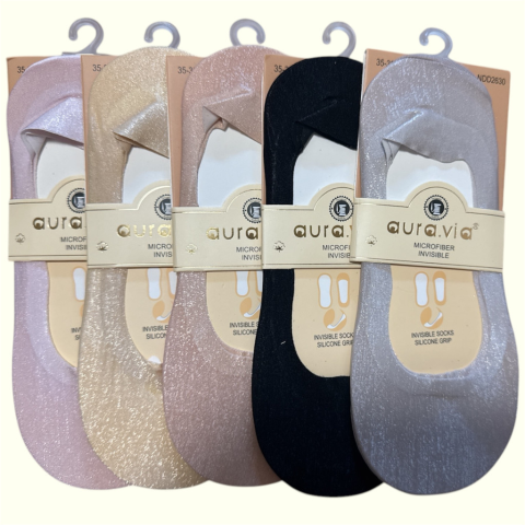 Auravia női csillogó titokzokni (5 pár, szilikonos sarokkal, rugalmas és elegáns) Ez az Auravia női titokzokni csomag 5 pár különböző színű csillogó zoknit tartalmaz. A zokni felső része fényes mikroszálas anyagból készült, míg a talprésze 95% pamutból,