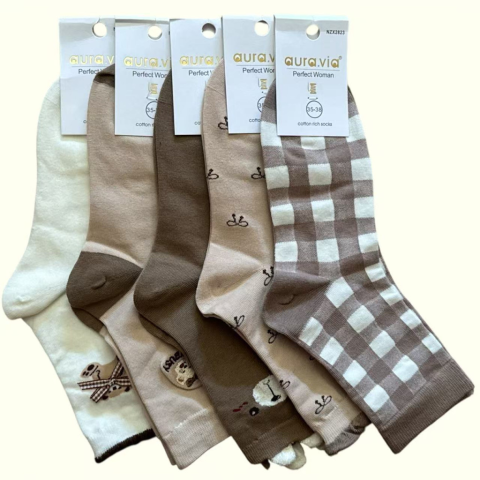 MR PAMUT Női normál szárú zokni szett – kávészínű, mintás, 5 pár Stílusos és kényelmes női zokni szett, kávészínű árnyalatokban és változatos mintákkal – ideális mindennapi viselethez. A szett tartalmaz egyszínű, kockás és aranyos rajzos mintás darabokat