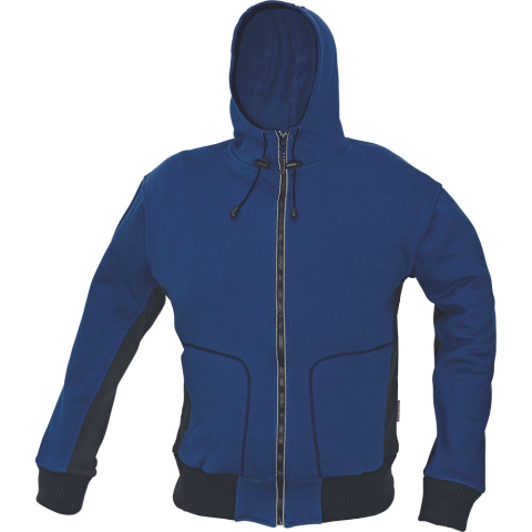Kapucnis pulóver kék Kardigán húzózsinórral állítható kapucnival, alsó szegés és mandzsetta extra széles bordázott patenttal. A pulóver puha tapintású, kényelmes viseletet biztosít akár egész napra is. Alapanyag: 80 % pamut, 20 % poliészter, 300 g/m² A